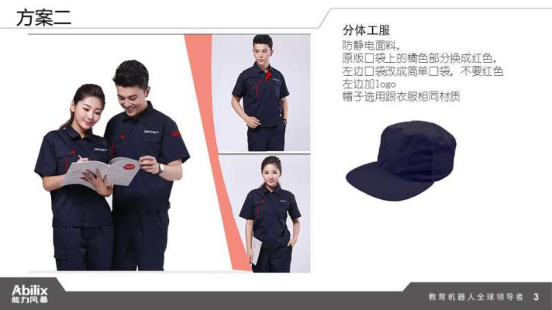 这两款是我们公司帮他们设计的方案,结果一致通过并最终达成交易。鹰诺达板式新颖、简约大方、配色充满时尚感。布料采用高档全棉、棉涤面料,舒适不起球不掉色,坚固可靠穿着舒适。此次他们公司采购的这批工作服是防静电涤棉纱卡布料制成的,包括帽子同样防静电。目前这批工作服已在打样生产。