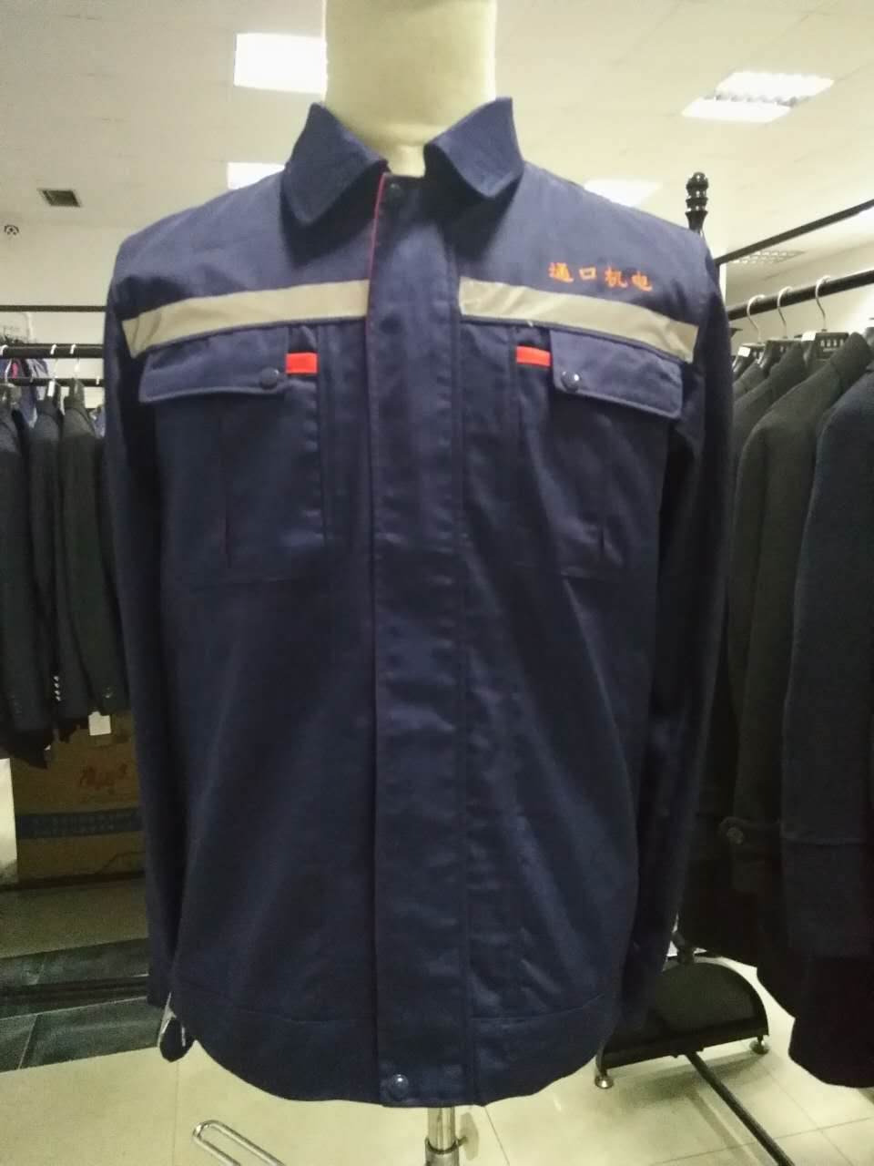 通口机电设备选择了AC069的款式,在其原有的基础上面做出了一些微小的调整,在前胸还有后背加上2.5公分的反光条,在反光条的上面栽刺绣上公司的LOGO,一款专属的通口机电工厂工服就诞生了。