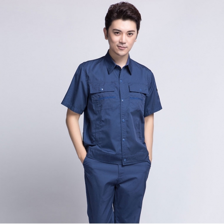 苏州鹰诺服装:深蓝配桔红短袖工作服AD069