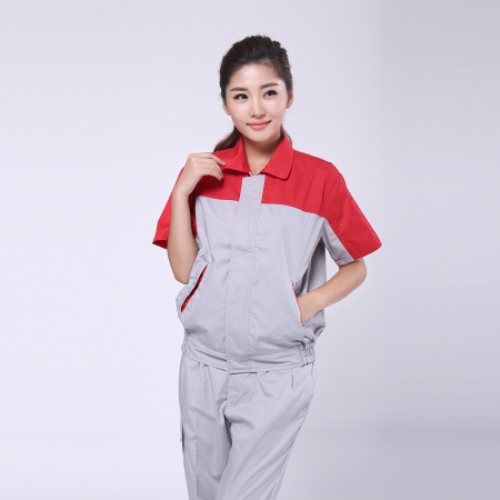 苏州鹰诺服装:大红配浅灰静电服AD078-JD